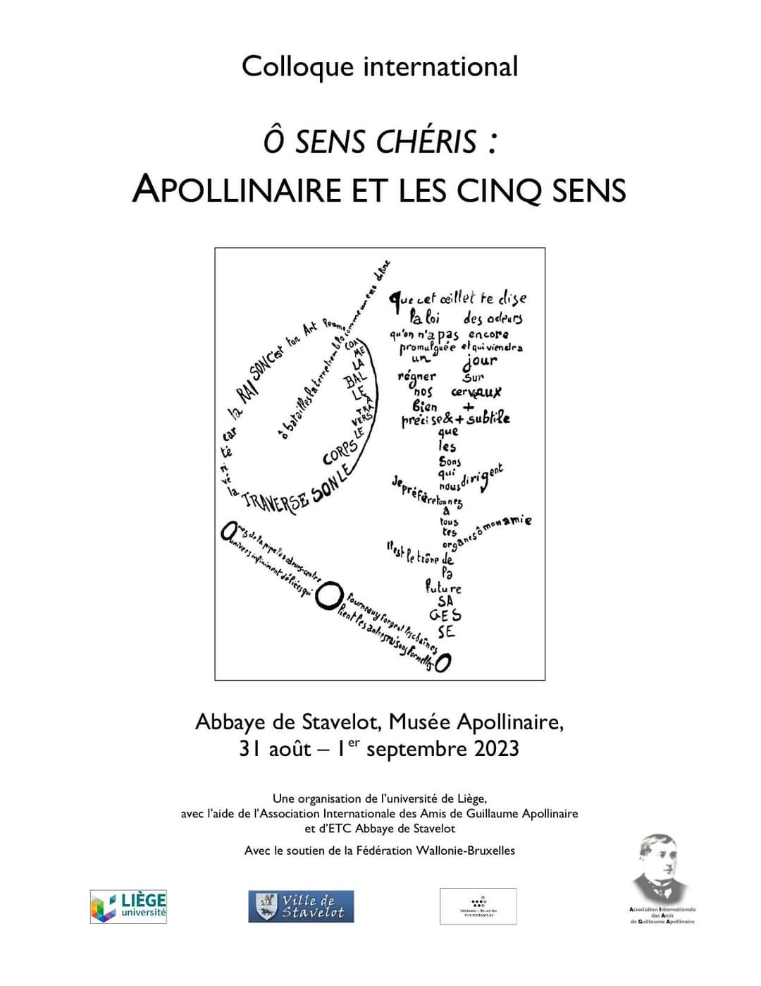 Colloque organisé par l’Université de Liège, par l’Université de Paris 3 Sorbonne Nouvelle et par l’Association Internationale des Amis de Guillaume Apollinaire avec le soutien de la Ville de Stavelot, Abbaye de Stavelot-Espaces Tourisme & Culture asbl, la Province de Liège-Culture, l’Ambassade de France en Belgique et la Fédération Wallonie-Bruxelles.