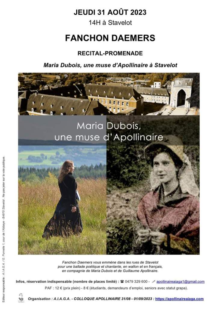 (*) Présentation & infos du RÉCITAL-PROMENADE Maria Dubois, une muse d’Apollinaire, à Stavelot par Fanchon DAEMERS, le jeudi 31 août à 14 h :