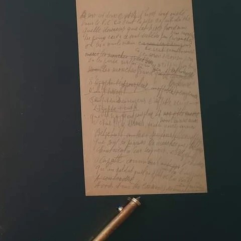 Deux autres lettres ont été écrites pendant la guerre. Enfin, le dépôt contient aussi un précieux carnet de notes datant du séjour capital d’Apollinaire en Allemagne en 1901-1902 et le brouillon d’un poème écrit au front en 1916. Extrait :