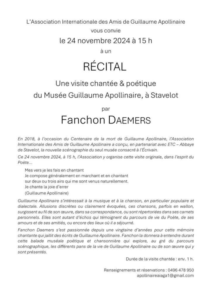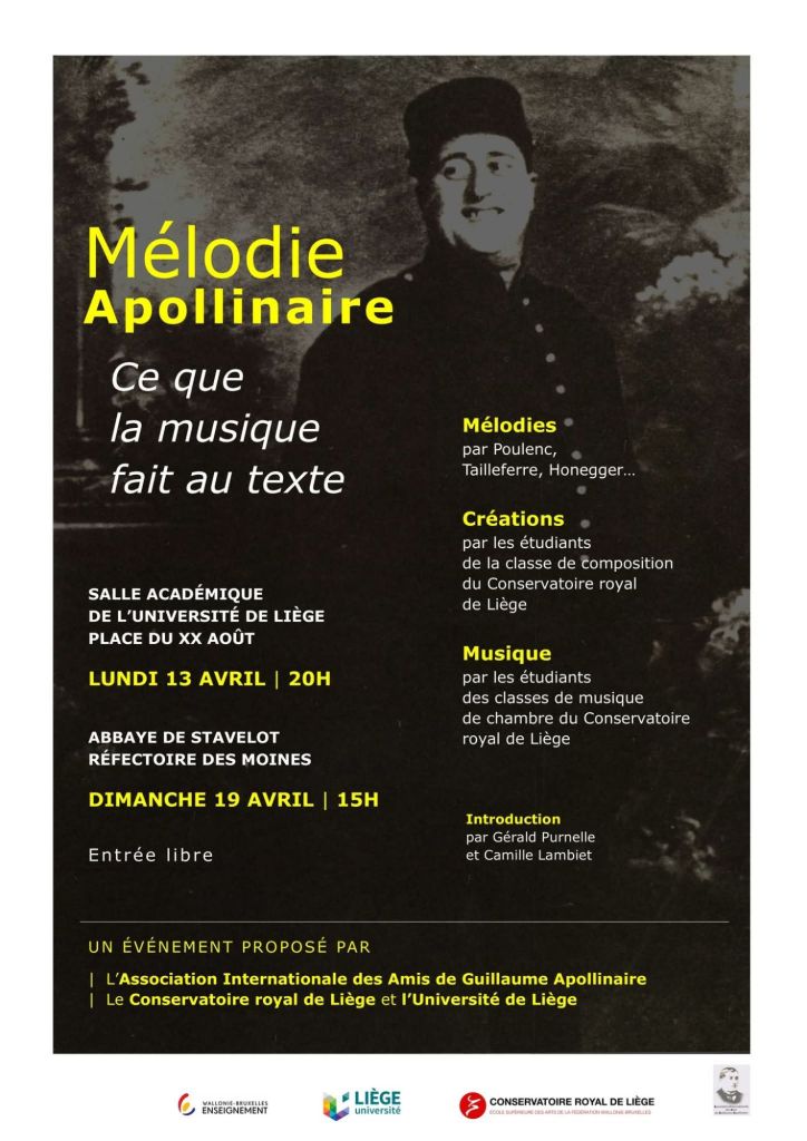 Organisé à Stavelot dans le cadre et avec le soutien de l’Association Internationale des Amis de Guillaume Apollinaire en collaboration avec l’asbl « Chant Libre » et Etienne DEBRAS (restaurant Ô Mal-Aimé).